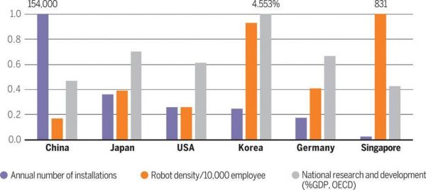 与此同时,IFR 也将韩国列为机器人密度最高的国家之一,销量不亚于日本地区。韩国政府也决定,该国的年度预算也将大范围投入到机器人研究与开发(R&D)当中,预计将有 1.5 亿美元至 2 亿美元的数额将投入到资本运作与新技术研发上,并且计划到 2023 年,韩国将把机器人市场规模扩大到 150 亿美元。
