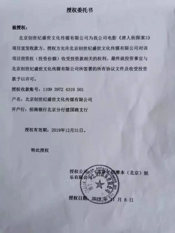 A发来的《授权委托书》中,纽摩本称创世纪是其项目宣发收款方,并授权后者对《唐探3》投资权收受投资款相关的权利。
