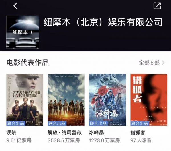 除了《唐探3》,这家全名为“纽摩本(北京)娱乐有限公司”的公司还联合出品过《误杀》、《冰峰暴》、《解放·终局营救》、《猎狐者》四部影片,前三部影片都已上映:其中《误杀》是贺岁档冲出的黑马影片,据猫眼专业版显示票房目前临近12亿元;《解放·终局营救》是李少红导演的献礼片,票房4100多万;《冰峰暴》是张静初主演的灾难片,票房1000多万。