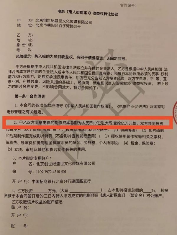只要把款打给创世纪的公共账户,再把合同签上名寄还给B,我就可以成为《唐探3》的投资人之一了。