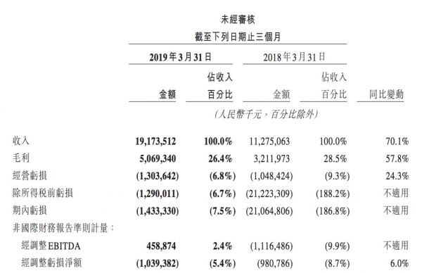 财报显示,报告期内公司总收入为192亿元人民币,相比2018年同期的113亿元同比增长70.1%。同时,2019年第一季度经营亏损13亿元,同比增长24%;经调整EBITDA为4.589亿元,转为正值。