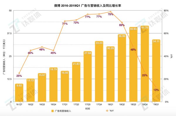 广告和营销收入方面,微博本季度营收3.411亿美元,与 17 年 Q1相比,同比增长13%,为近 3 年来最低,与去年同期 79%的同比增长率相差悬殊;与18年Q4相比,环比下降 18%。