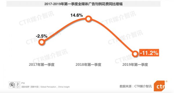微博广告收入下滑背后,是中国广告市场的总体颓势。据CTR最新发布的2019年第一季度中国广告市场数据,受广告主信心波动影响,一季度中国广告市场较去年同期整体下降11.2%,互联网广告市场整体同比下滑 5.6%,与去年同期的涨幅5.4%相比,相去甚远。