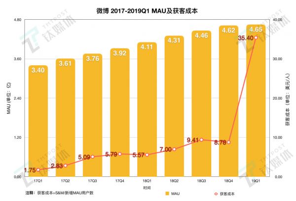 获客成本数据,可以从另一方面反映这个问题:微博 2019Q1 销售和营销费用为1.62 千万美元,我们这里用销售和营销费用/新增MAU用户数,计算一下17年Q1以来微博的获客成本: