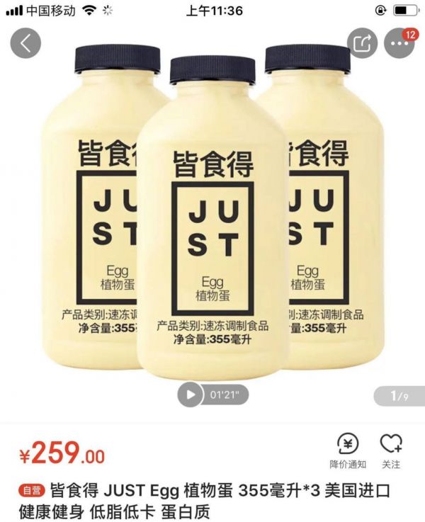 5月15日,美国食品公司JUST的植物蛋宣布进入中国市场,目前已经在京东上发售。燃财经在其官方旗舰店看到,目前只上线了一款335毫升装的植物蛋,3瓶售价259元,保质期75天。