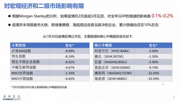 高鹄资本 金明:疫情对经济的影响是暂时的,看看上市之后二级市场受到的影响怎么样?过年最后一周出现拐点,其实股市并没有跌太惨。从1月20日到现在的两周,股市比较淡定,大部分的伤害和受益都是暂时的。