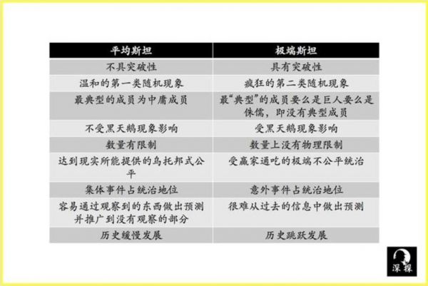 要理解“黑天鹅”,先需要理解纳西姆·塔勒布提出的两个重要概念——平均斯坦,极端斯坦。“斯坦”这个词是塔勒布自己创造出来的,意指平均性。
