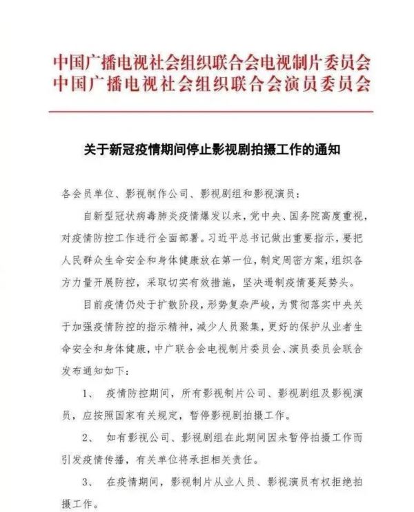 一则《关于新冠疫情期间停止影视剧拍摄工作》的通知,让原本焦虑的影视制片行业更添阴霾。去年年底,多家影视剧行业巨头已经陷入亏损状态,而春节档电影在线下院线几乎颗粒无收。同时,全国多家演出剧院也都贴出演出取消或延期至下半年的通告。可以预见,伴随着在一季度新冠疫情防控工作的持续,影视剧、综艺拍摄录制,乃至线下演出很可能将在今年一季度处在完全停摆状态。