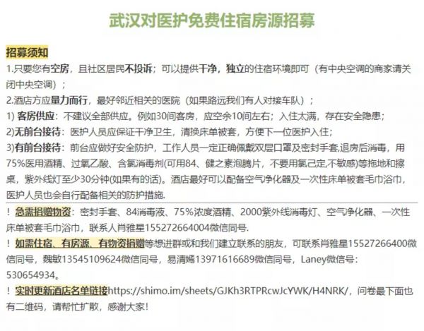 当天,肖雅星与武汉部分酒店业主自发的组织了“武汉医护酒店支援群”,成立了武汉医护酒店支援联盟,并征集不带中央空调的酒店自愿为武汉地区各大医院的一线医护人员免费提供住宿。