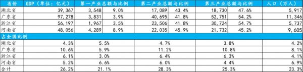湖北的第一产业占比较高,二三产业比重差异较小,浙江和广东第一产业占比低,第三产业占比显著高于第二产业。