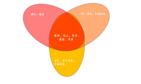 整体来看,几个省份交叉相对集中的一级行业集中于医药生物、电子、化工、通信、汽车为主,其中湖北省的建材、广东省的家电和机械设备,以及浙江省电气设备和机械设备为相对特例行业。