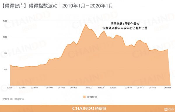 得得智库综合得得指数数据显示,2019年6月和7月为全年波动最为剧烈的月份,但整体来看年末仍较年初有所上涨。