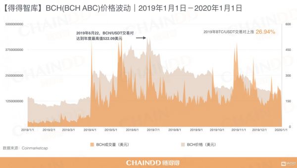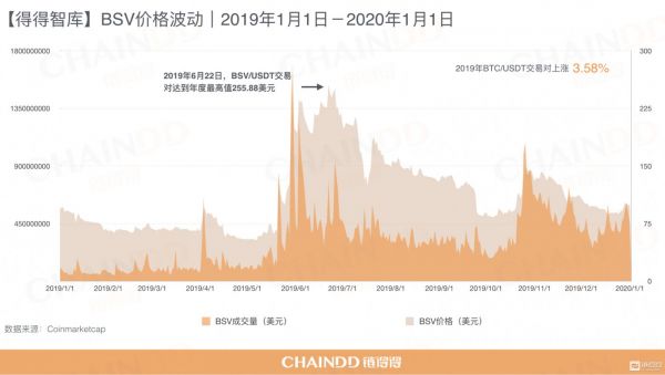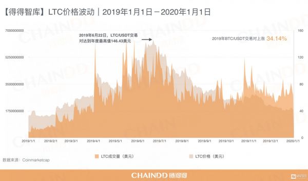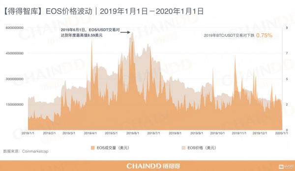 得得智库对2019年主流数字货币(BTC、ETH、BCH、BSV、LTC、EOS)⾏情进行复盘回顾,从价格走势和交易量两个维度进行数据呈现。