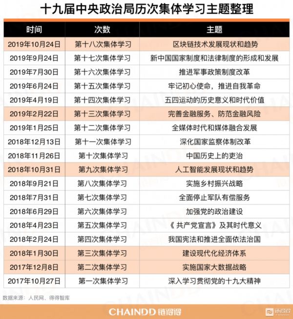 据得得智库统计,从2017年10月27日起,十九届中央政治局已开展共计18次集体学习,2019年开展共7次集体学习。