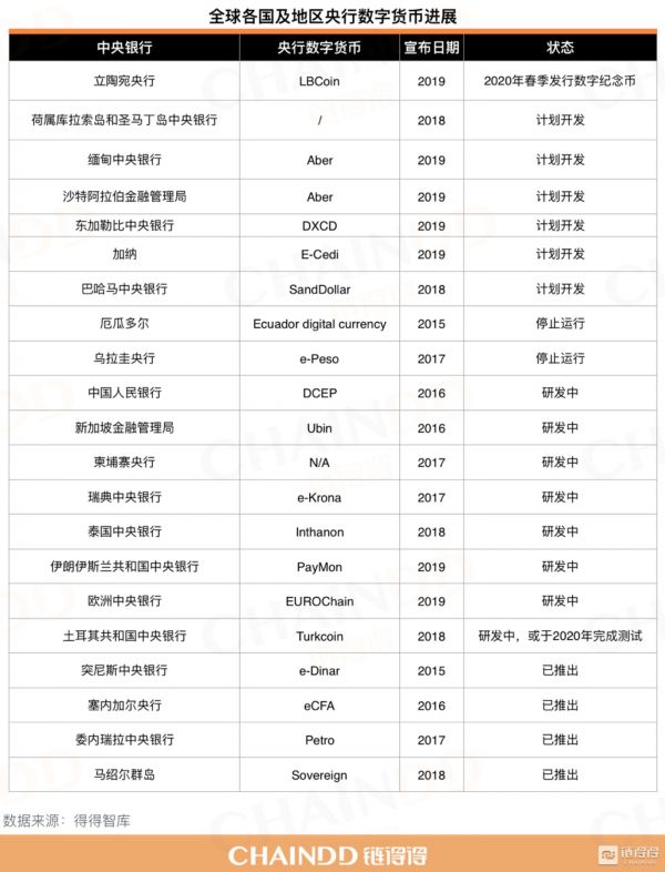 受Libra带来的冲击,全球各国政策陆续对央行数字货币的表态,同时公布了央行数字货币研发的进展。中国在2019年一马当先,中国人民银行方面多次透露研发进度,央行数字货币呼之欲出。