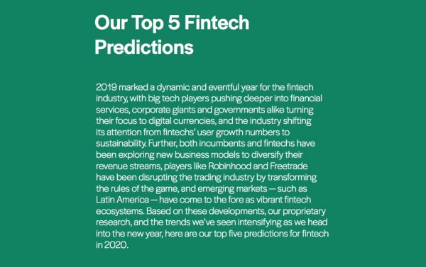 基于这些发展、我们的专有研究以及我们在新的一年中看到的不断加剧的趋势,以下是我们对金融科技2020年的五大预测。