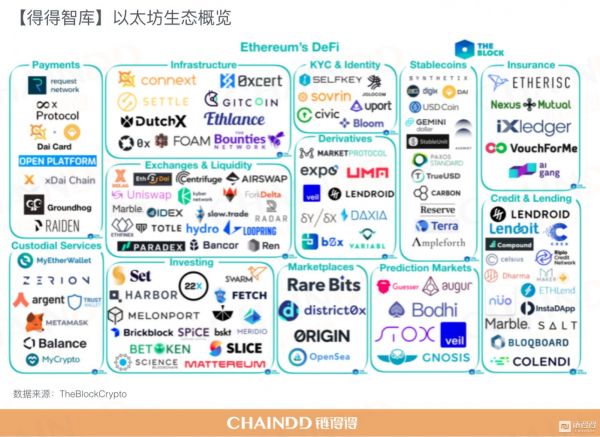 据得得智库统计,目前主流的去中心化金融应用,包括:支付、衍生品、稳定币、通证化、去中心化交易所等。