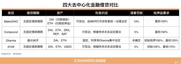 目前的热门借贷平台有MakerDAO(发行稳定币)、Dharma和dYdX(P2P形式)、Compound(流动池交易)。四者之间的区别将以下图来直观表现: