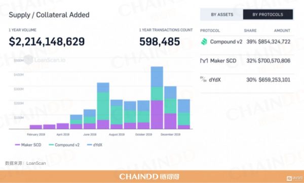 得得智库汇总了近一年来热门去中心化借贷平台的历史数据发现:在2019年的5月、6月、7月为中心化借贷平台爆发式增长的月份,Compound与dYdX呈现爆炸性增长。快速增长部分归功于2019年更新的协议和产品,如Dharma为终端用户提供非常简单的用户体验,dYdX则推出了交易所,Compound也做了很多技术改进,发布了2.0版本v2。