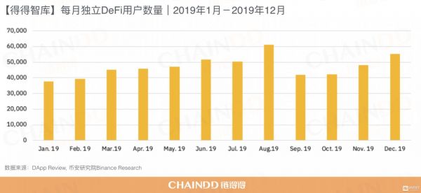 2019年,每月独立的DeFi用户数量在4万到6万之间。1月独立用户数最低,8月年度最高。