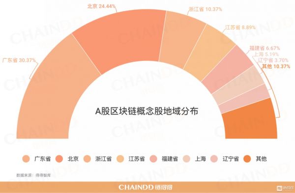 得得智库根据东方财富Choice的数据整理,目前包括备案企业在内的和曾经公开表示过“涉及区块链”的A股上市公司有153家。从地域来看,广东有41家,北京有33家,浙江有14家,其次分别是江苏、福建、上海等地。