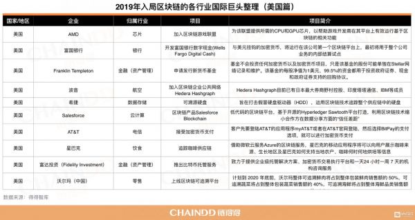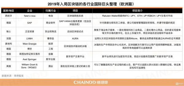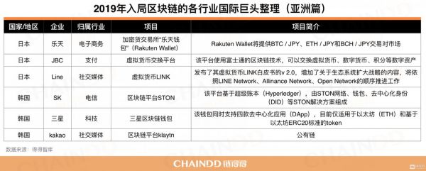 得得智库对2019年宣布入局的各行业国际巨头做了总结后发现:1、亚洲地区日本和韩国企业较为积极;2、美国金融和IT技术类巨头更愿意参与;3、欧洲企业更多的选择在供应链和确权验真。