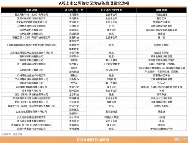 得得智库综合两批境内区块链信息服务名称及备案编号的发布情况发现:A股直接备案或间接参与备案的上市公司为46家。技术应用主要分布在底层平台、溯源公益、贸易金融、供应链金融、身份认证和版权确权等领域。