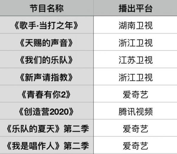 根据音乐先声的不完全统计,目前受到影响的音乐综艺如下: