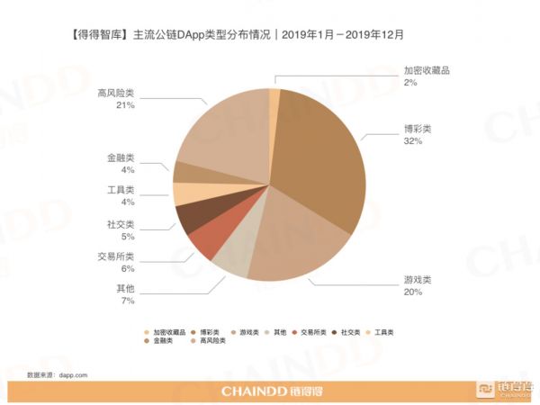 得得智库通过数据统计,将当前 DApp 分为金融、博彩、高风险、交易所、金 融等类型。其中博彩类稳坐 DApp 排行榜第一位,占比为 32%,相较于 2018 年的占比 29%有所提高。而游戏类占比相较于 2018 年的 26%有所下滑。