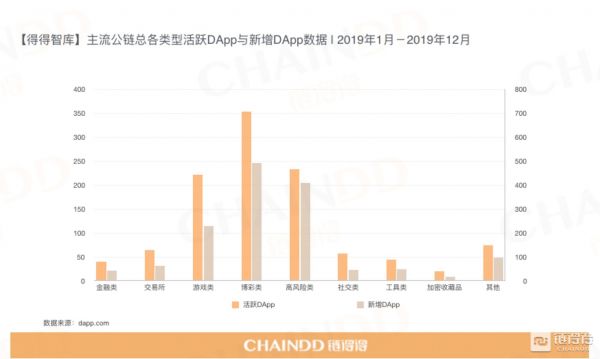 得得智库通过数据统计,2019 年博彩类和高风险仍然是最受欢迎的 DApp,新 增 DApp 数近 900 个。博彩类活跃 DApp 近 700 个,占活跃 DApp 总数的 30%。 自 2018 年下半年开始,王座便从游戏类 DApp 转移到博彩类 DApp,因开发平 台是以区块链为底层架构,因此公平性可以得到保障。此外,博彩类 DApp 给 赌博爱好者提供了规避各国法规监管的最佳途径。