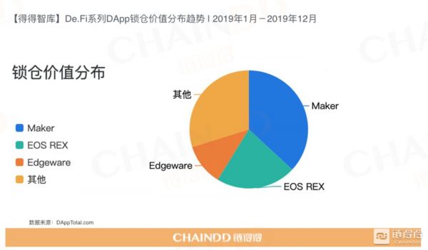 得得智库据DAppTotal.com数据统计,截至 2019 年 12月 31 日,排名前 5 的 DeFi 应用分别是:Maker、EOSREX、Edgeware 、Compound、 InstaDApp。除去 Edgeware 属于锁仓空投外,其余均属于借贷类。
