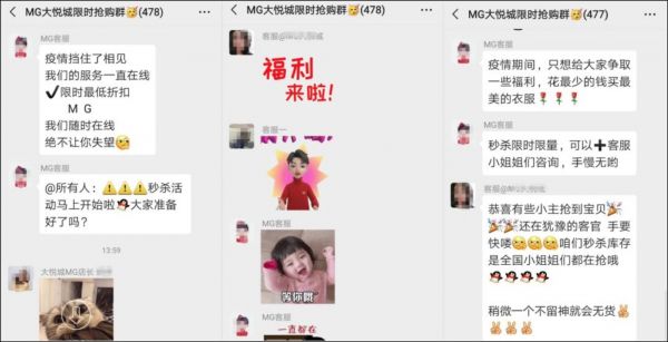 朝阳大悦城MG女装导购张子怡提到,特殊时期,他们把店铺搬到了朋友圈,建群卖货都是“公司统一规定”,当前目标主要是“保住销量”。由于秒杀价已低至平时的3-5折,目前他们的秒杀群销量已经跟跟平时门店业绩差不多。