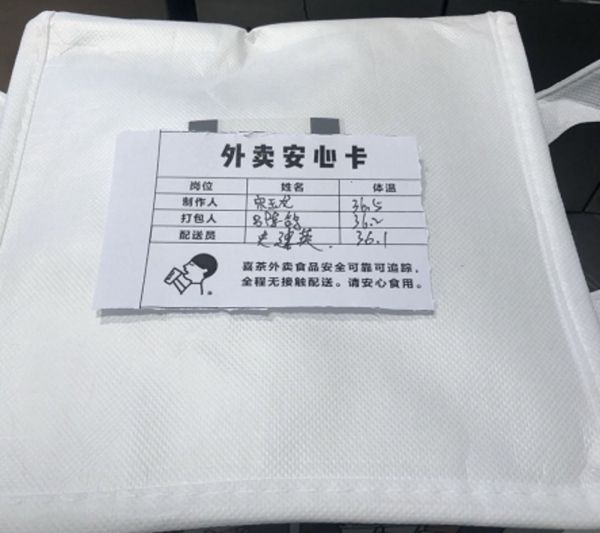 此外,据《深网》统计,大部分展开外卖业务的餐饮企业都自己配备了“安心卡”,上面都要标注餐食制作人、打包员、配送员的姓名和体温。