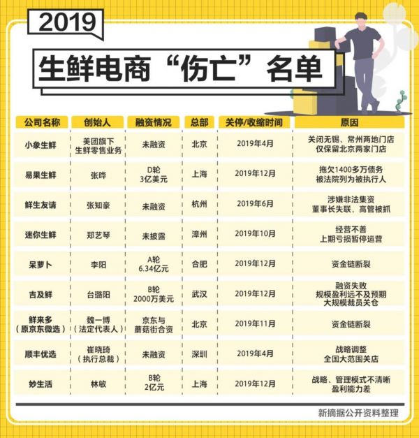 犹记得去年10月,总部位于漳州的“迷你生鲜”称因企业经营不善、长期亏损暂停运营;11月,生鲜电商呆萝卜杭州中心正式关闭,还拖欠了300多位杭州及部分合肥员工工资;12月,易果生鲜因拖欠1400多万债务,被法院列为被执行人……