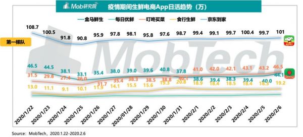 足不出户送货到家的购物需求激增,生鲜电商供不应求,各类买菜APP的日活也水涨船高。据Mob数据统计,春节期间京东到家日活突破100万,盒马鲜生,叮咚买菜双双突破40万。