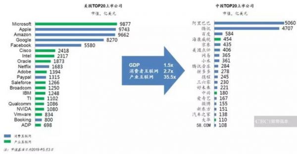 上图中国的公司包括了在美国、香港与大陆A股上市的公司,第一次统计的时候,前20家公司里有16家To C,4家To B,现在还少了一家To B。当时美国和中国GDP的比重是1.7:1,美国消费互联网和中国消费互联网公司的比重大概是2.5:1。