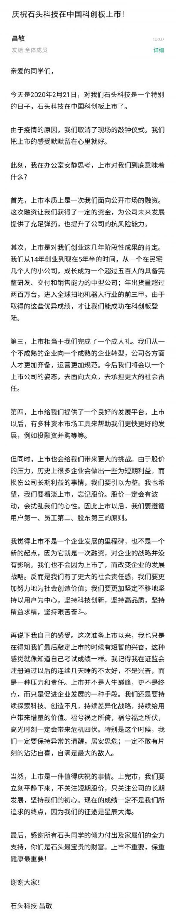 石头科技董事长昌敬也在内部信中表示:“上市本质上是一次我们面向公开市场的融资。这次融资让我们获得了一定的资金,为公司未来发展提供了充足弹药,也提升了公司的抗风险能力。上完市,我们要立刻平静下来,不关注短期股价,只关注公司的长期发展,坚持我们的初心。现在的成绩一定不是我们所追求的终点,因为我们的征途是星辰大海。”