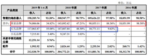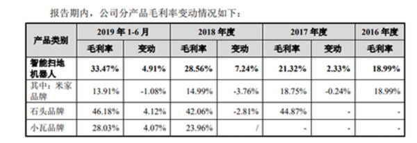 但由于米家品牌系列产品以性价比著称,并且采用利润分成模式,石头科技米家品牌扫地机器人毛利润并不高,并呈现出逐步下滑之势,影响了整个公司的盈利。招股书显示,2016年至2019年上半年,石头科技米家品牌毛利率分别为18.99%、18.75%、14.99%和13.91%。
