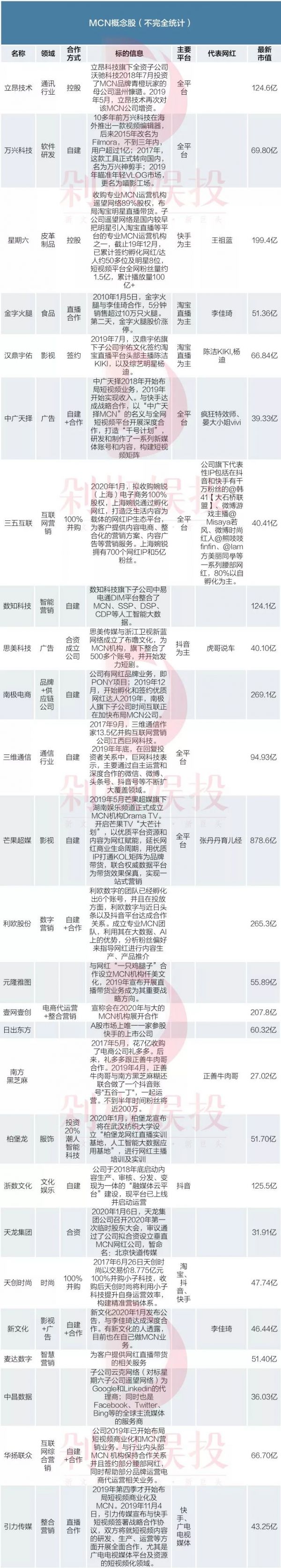 这两个事件之后,上市公司就冒出了多个MCN概念股,根据剁椒娱投的不完全统计如下: