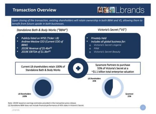 在L Brands的这笔交易后,原本L Brands旗下的两条业务线BBW和维秘将被拆分开来,其中BBW将继续作为独立业务,在纽交所保持上市地位;而维秘则将成为一家私有企业,由私募机构Sycamore Partners所控股经营。