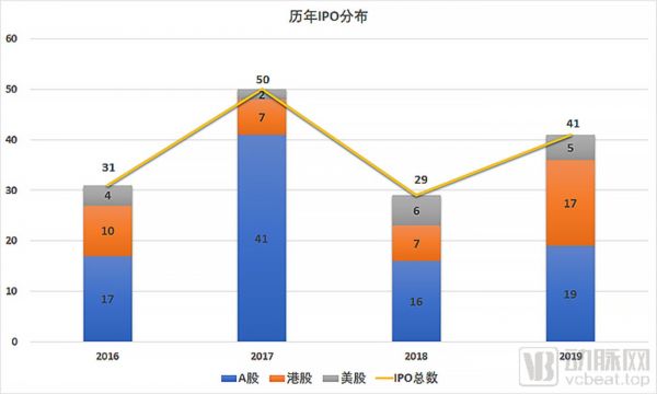 其中,A股IPO次数共有19次;港股IPO则有17次,紧随其后;另外,还有5次IPO发生在大洋彼岸的美国。