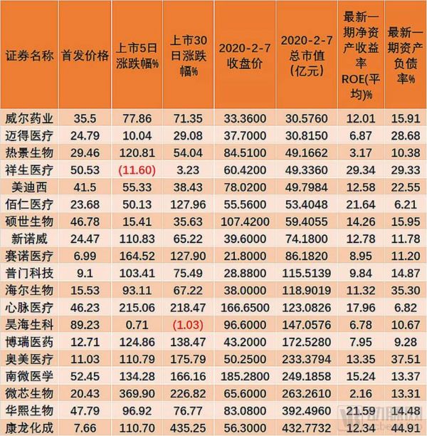 从股价走势来看,绝大部分企业在上市后股价都迅速走高。除了一家企业跌破发行价外,18家企业股价都有不同程度的上涨,上市5日平均涨幅109.15%,上市30日平均涨幅达到118.52%。到2020年2月7日,所有19家企业的当日收盘价均比首发价实现了大涨,多数企业股价均有数倍的提升。