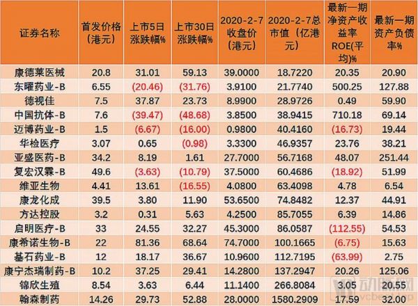 康龙化成(300759.SZ)虽然是在创业板上市,募资也低于平均值,但却创造了30日最大涨幅的记录,高达435%。也就是说,其股价在30日时的收盘价是首发价的5倍多。截止2020年2月7日,其总市值为432.78亿元,是2019年在国内IPO健康企业中市值第一的企业。同时,康龙化成也在港股IPO,并有着不俗的表现。