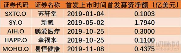 这5家企业首发募资净额总计为2.74亿美元,相比2018年的5.34亿美元大幅下滑。不过,相比2017年的1.83亿美元和2016年的2.49亿美元,这一表现也是相当不错的。其中,新氧一家就获得了超过半数的首发募资净额,为1.79亿美元。