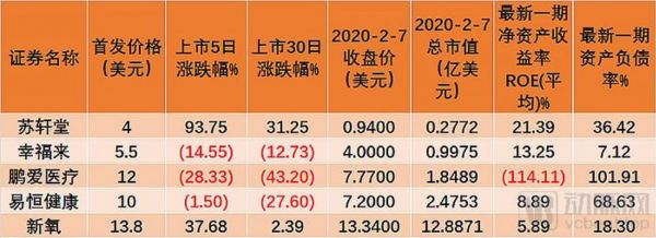 截至2020年2月7日收盘,所有5家企业均跌破首发价。新氧是其中表现最好的医疗企业,当日收盘价为13.34美元,仅比13.8美元的首发价略微下跌。其他4家企业的股价下跌幅度均不小。