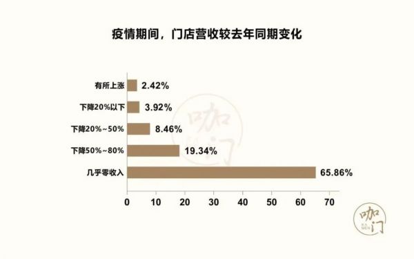 而在未营业的情况下,相比去年同期,65.86%门店几乎零收入,19.34%门店下降50%~80%,合计占比85.2%。