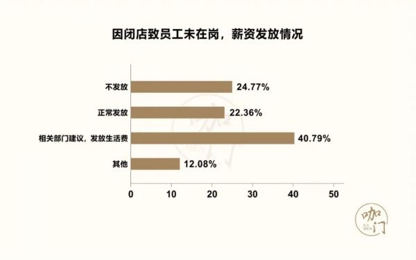 因疫情导致闭店未到岗的员工,在薪资发放上,40.79%门店根据相关部门建议,发放生活费,占比最高;其次24.77%门店采取不发放薪资措施,仅有22.36%门店正常发放员工薪资。