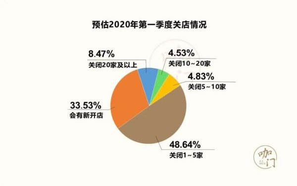 预估2020年第一季度关店情况,评定疫情长期影响发现:将关闭1~5家店的占48.64%,但表示会开新店的品牌也高达33.53%。