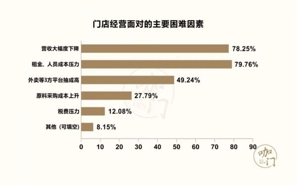 调查门店经营中面临的困难,租金、人员成本,以及营收大幅度下降是主要难题。其次,外卖平台的第3方抽成高也让茶饮门店存在压力。