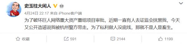 网传史玉柱被警方带走 不久后其发微博疑似侧面否认